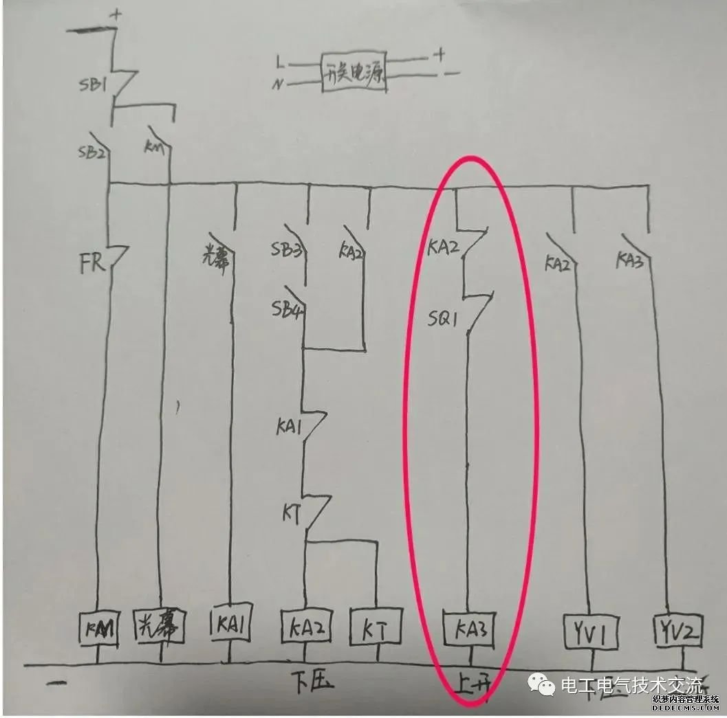 不在原位自動(dòng)上升,雙手按住SB3、SB4,KA2通電,電磁閥YV1通電,液壓機(jī)下壓。